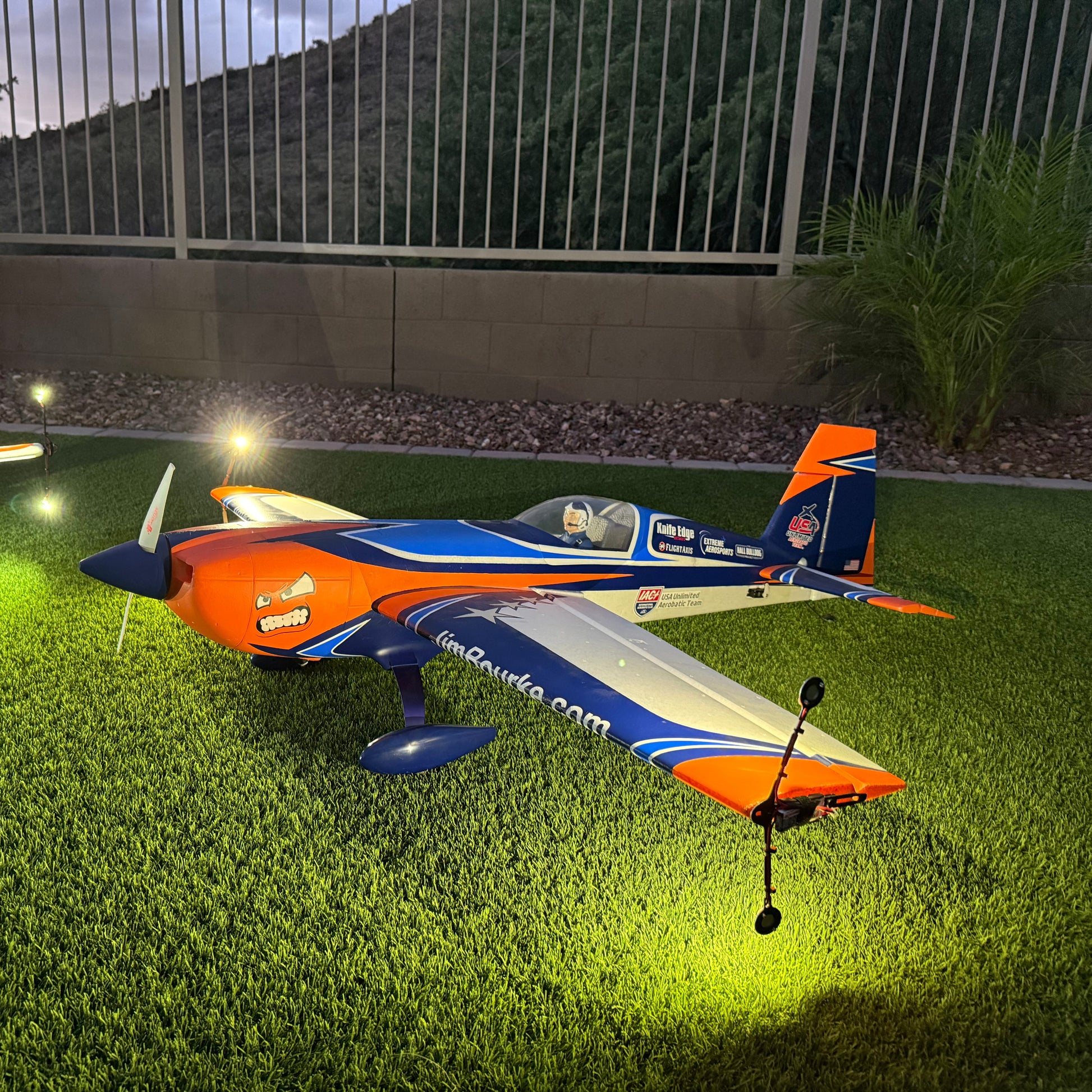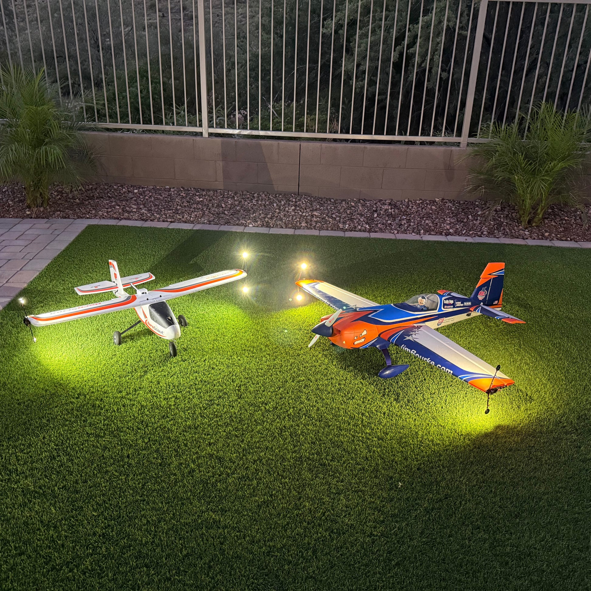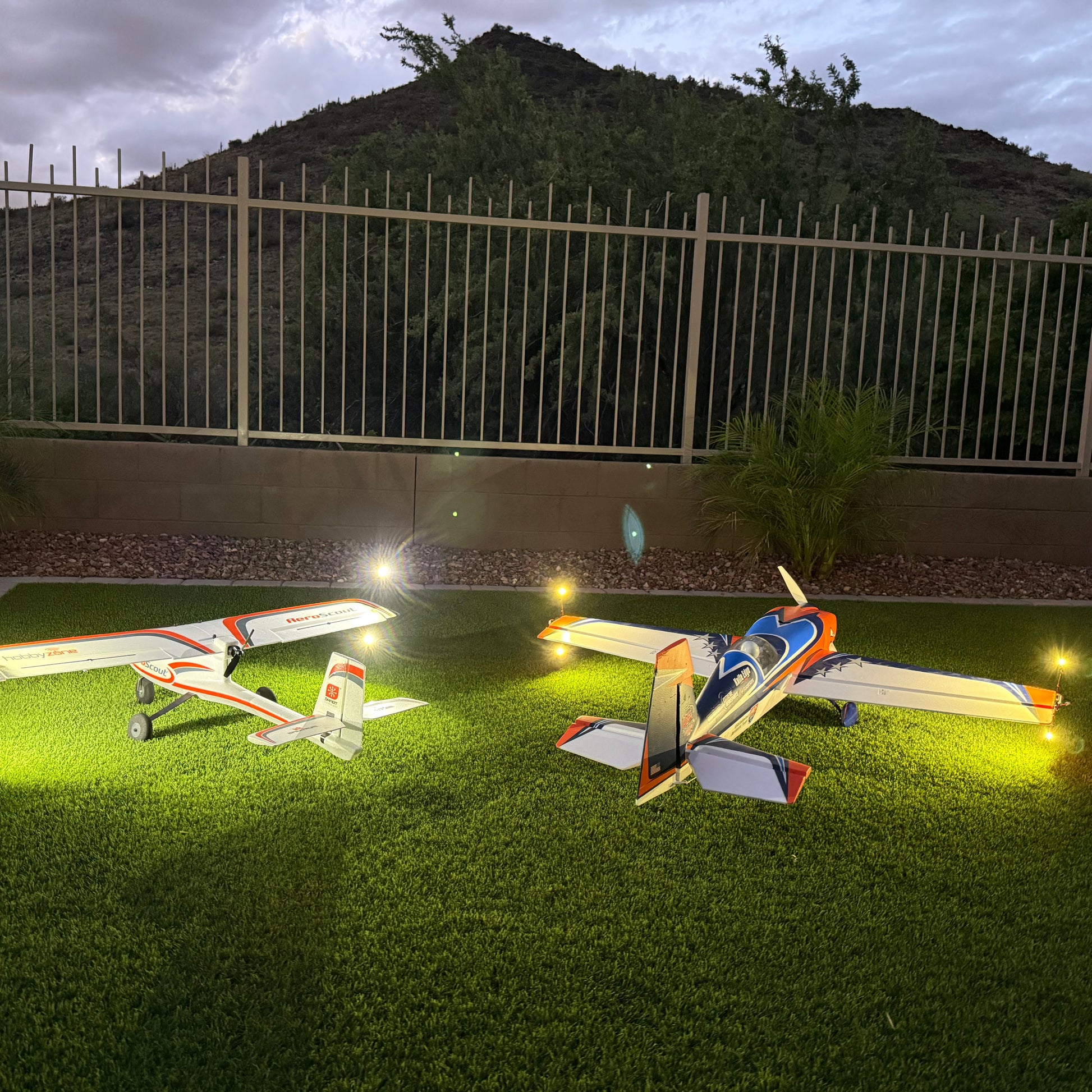 The MiniRails are lightweight, high-output night lights built for 40"–75" class RC airplanes. Weighing under 25 g per side, they deliver a clean, balanced glow without throwing off your CG. Precision diffusers and anti-shine caps spread light evenly, making night flying sharper, smoother, and easier on the eyes.